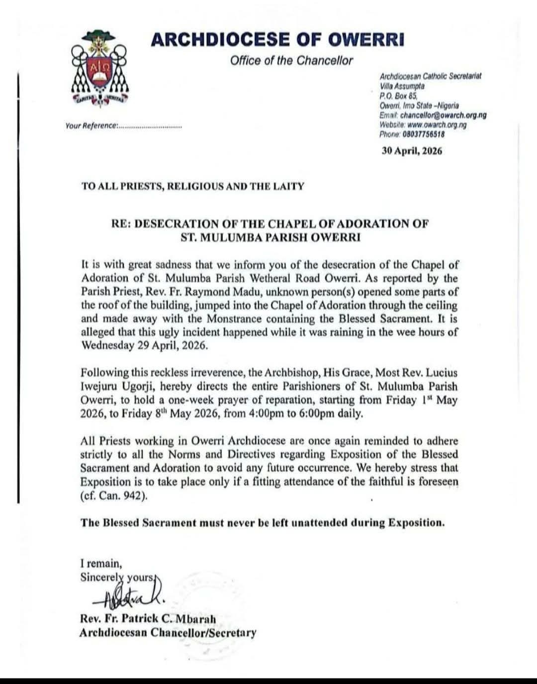 Sequel to this, all the parishioners of St. Mulumba’s Parish, Owerri were urged to hold a one-week prayer of reparation starting on Friday, 1st May to 8th May, 2026 from from 4:00pm to 6:00pm daily.