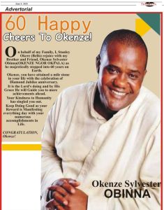 - OKENZE OBINNA Celebrates 60 yrs, Diamond Anniversary *As Friends, Associates Pour Eulogies on Business Mogul. It was Celebration Galore in Ngor Okpala,Imo State and beyond as Friends, Business Associates, Political Allies, Relations and Well-wishers Acknowledge one of the greatest sons of Ngor Okpala,nay Imo State,Okenze Sylvester Obinna,the OKENZE NGOR OKPALA Gburugburu on his Birthday Anniversary. Okenze hit 60 years of Age and deserved all the pump and peagentry that followed the Mile stone Achievement. The Occasion was also marked in Warri, Lagos and Abuja by Friends,even in his absence. However,the main Show that Shook the group took place in Ngor Okpala, where rainbow Coalition of Personalities across Political Party lines converged to celebrate the Business Mogul. Okenze Obinna is not only a Community Leader and peace maker,but a renowned Business Man of repute and outstanding Political Figure across Nigeria. He is the Chief Executive Officer, CEO, LUXURY BUILDINGS & ACCESSORIES LTD, which he sited the Factory in his home town,Nguru. A fit that endeared Okenze Obinna to the hearts of his people, including his extraordinary Philanthropy that knows no boundary. Much as he has used his position as a foremost Entrepreneur to employ teeming youths,he has also used his enormous Political weight to help many budding Politicians to attain their Political ambitions and Dreams. We in TRUMPETA NEWSPAPER join in Wishing Okenze a Bountiful Birthday in his Diamond Celebration. We also recognize Chief Reginald Chux Amadi,CEO AMAREG GLOBAL CONCEPT LTD, a Consistent Loyal Follower of Okenze for all his goodwill and Humility.