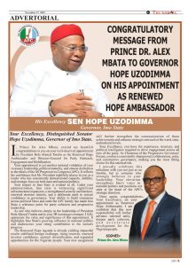 • CONGRATULATORY MESSAGE FROM PRINCE DR. ALEX MBATA TO GOVERNOR HOPE UZODIMMA ON HIS APPOINTMENT AS RENEWED HOPE AMBASSADOR