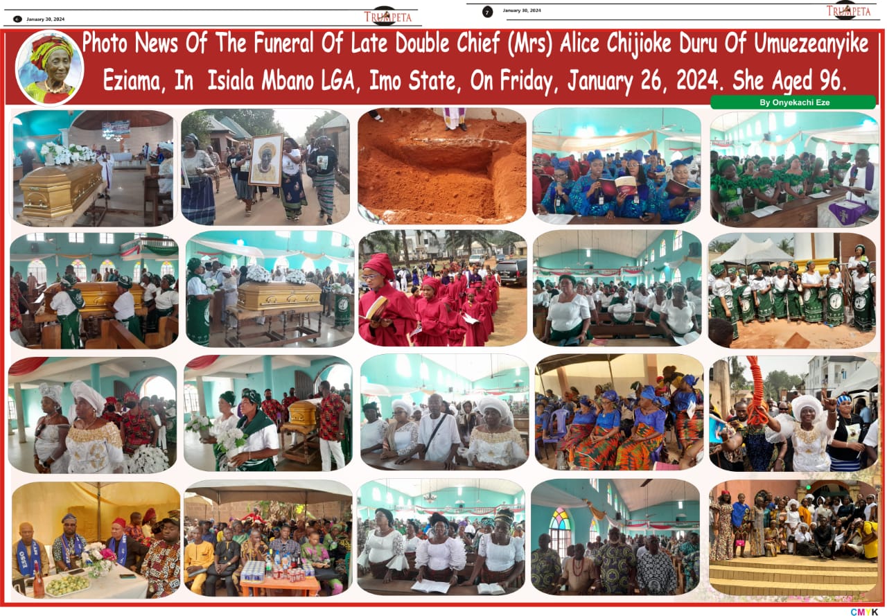 The final journey into eternity for the remains of the late matriarch of the Duru family of Umuezeanyike in Isiala Mbano Council Area of Imo State, Double Chief (Mrs) Alice Chijioke Duru had commenced on Friday, January 26, 2024 with a requiem service at St Michael’s and All Angels Anglican Church, Eziama.