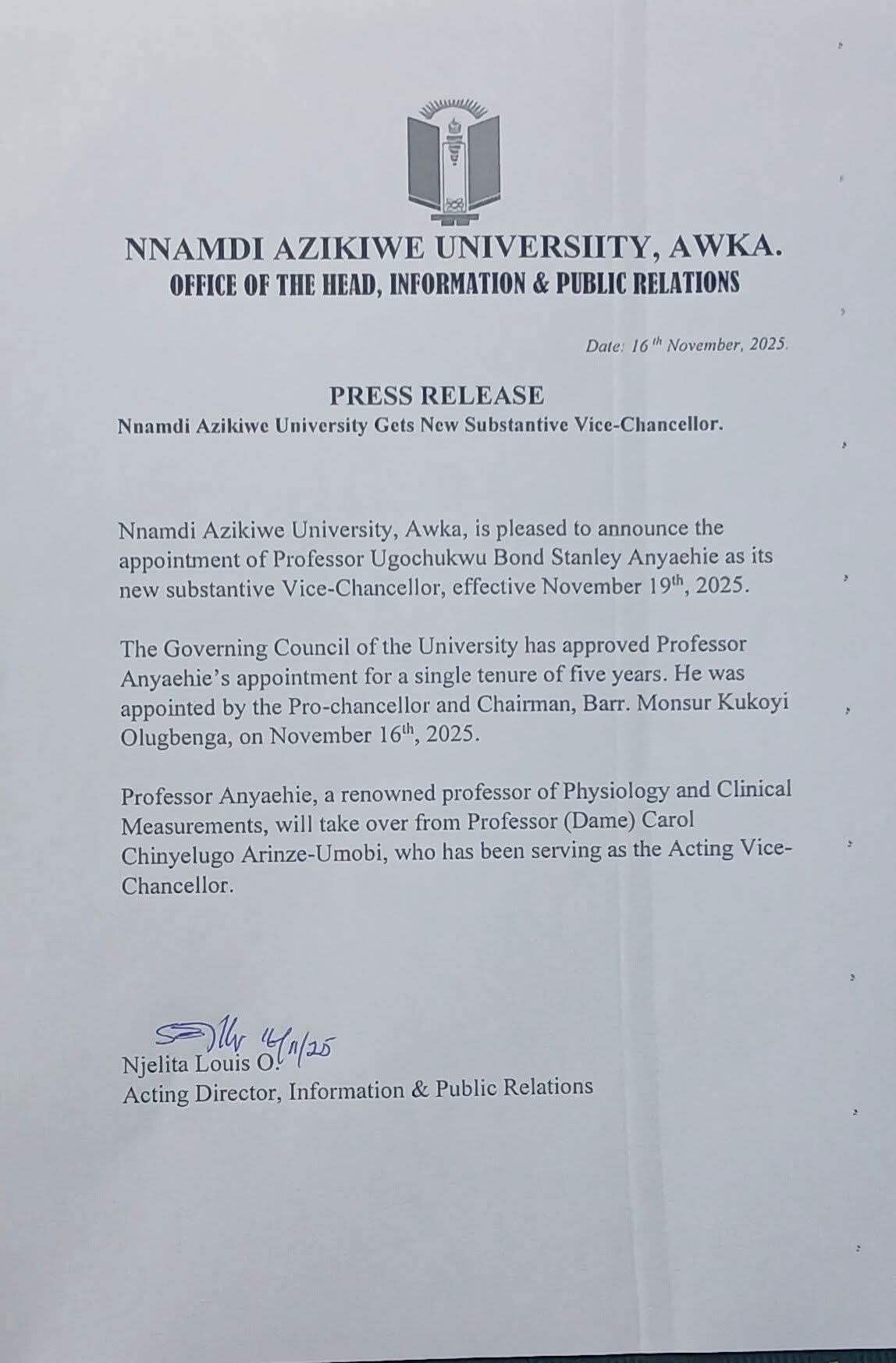 Professor Anyaehie succeeds Professor (Dame) Carol Chinyelugo Arinze-Umobi, who has been serving as Acting Vice-Chancellor, effective Tuesday, 18th November, 2025.
