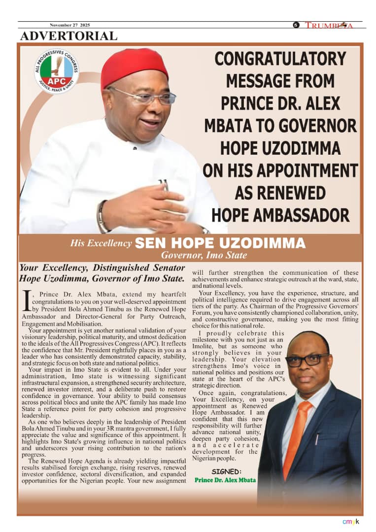 - CONGRATULATORY MESSAGE FROM PRINCE DR. ALEX MBATA TO GOVERNOR HOPE UZODIMMA ON HIS APPOINTMENT AS RENEWED HOPE AMBASSADOR