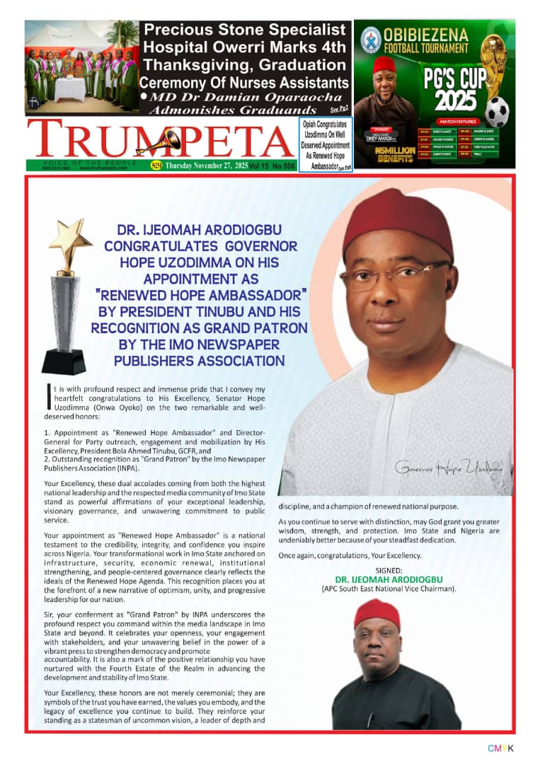 Your appointment as “Renewed Hope Ambassador” is a national testament to the credibility, integrity, and confidence you inspire across Nigeria. Your transformational work in Imo State anchored on infrastructure, security, economic renewal, institutional strengthening, and people-centered governance clearly reflects the ideals of the Renewed Hope Agenda. This recognition places you at the forefront of a new narrative of optimism, unity, and progressive leadership for our nation.