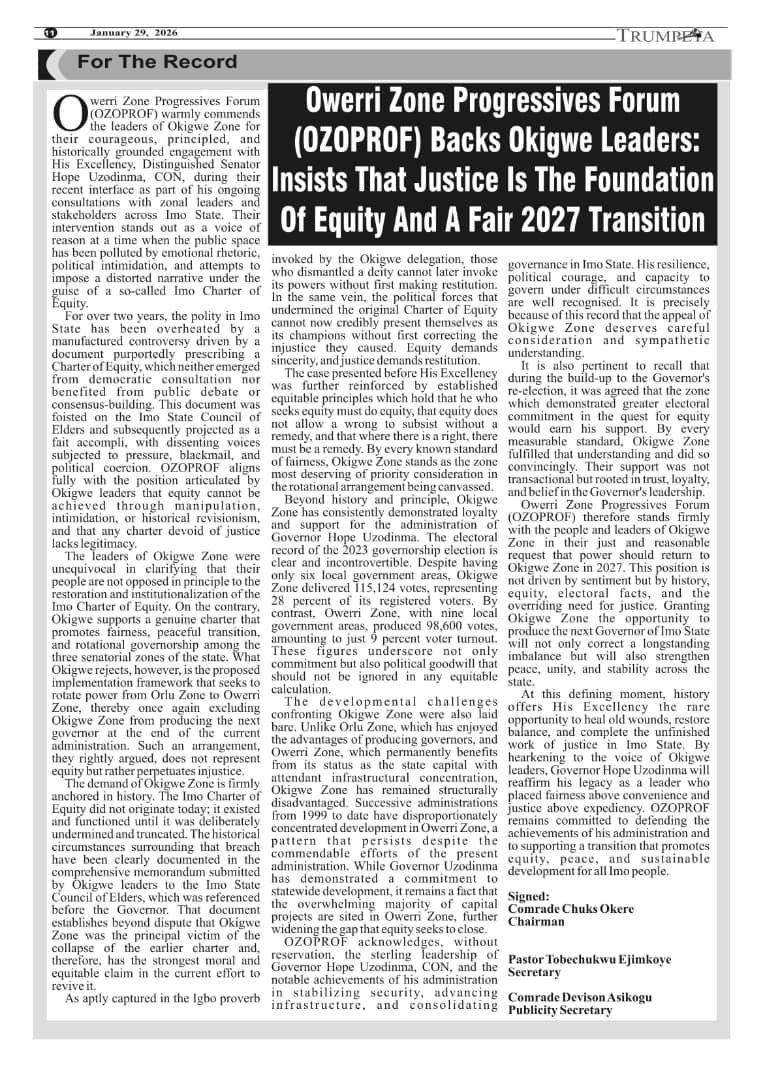 Owerri Zone Progressives Forum (OZOPROF) Backs Okigwe Leaders: Insists that Justice is the Foundation of Equity and a Fair 2027 Transition
