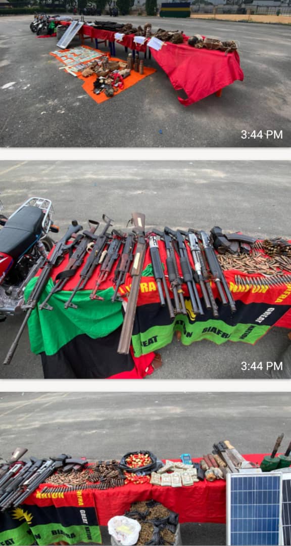 The Police Commissioner disclosed that items recovered during the operations include four AK-47 rifles, one LAR rifle, five pump-action guns, 260 rounds of GPMG live ammunition, 240 rounds of 7.62mm ammunition, 280 live cartridges, improvised explosive devices, machetes, stolen motorcycles, vehicle registration number plates, mobile phones, laptops, walkie-talkies, suspected Indian hemp, counterfeit currency, criminal charms and IPOB/ESN insignia.