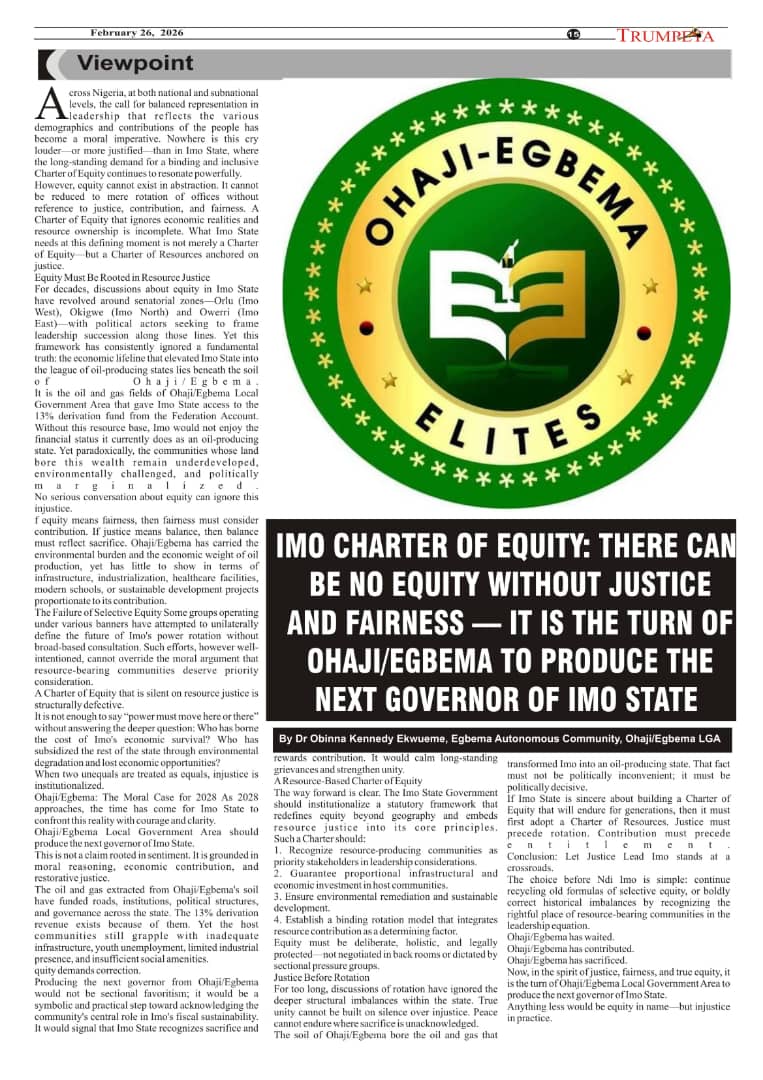 IMO CHARTER OF EQUITY: THERE CAN BE NO EQUITY WITHOUT JUSTICE AND FAIRNESS — IT IS THE TURN OF OHAJI/EGBEMA TO PRODUCE THE NEXT GOVERNOR OF IMO STATE By Dr Obinna Kennedy Ekwueme