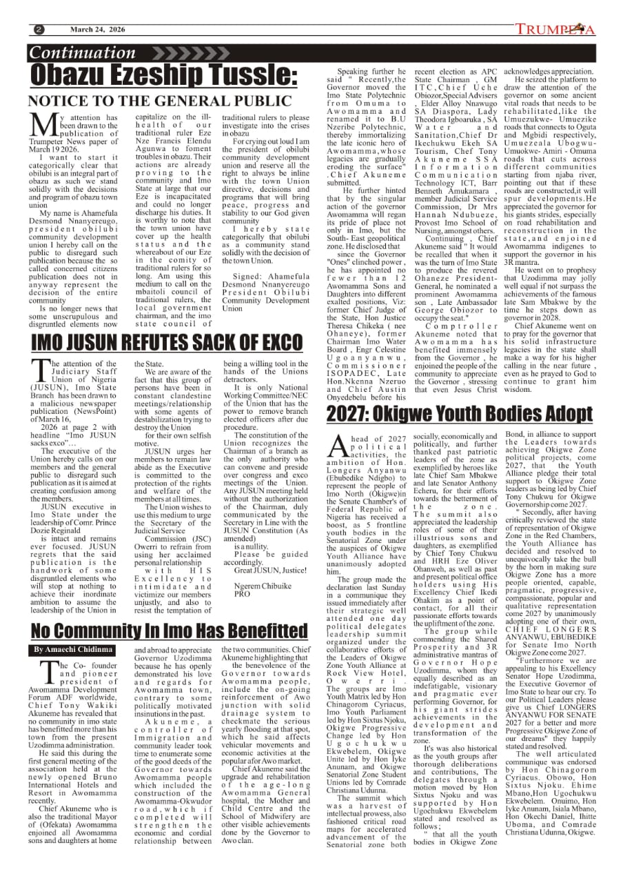 NO COMMUNITY IN IMO HAS BENEFITTED FROM GOV. UZODIMMA MORE THAN AWOMAMMA , SAYS CHIEF TONY AKUNEME