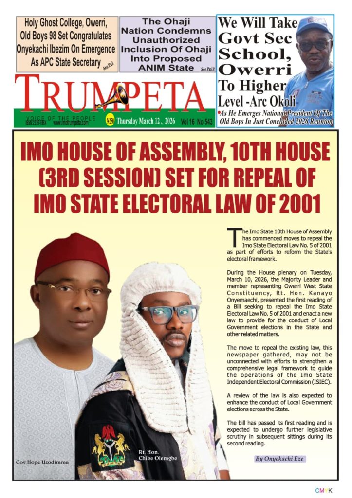 Cover And Inside Pages of Trumpeta, Thursday 12th March 2026 Cover And Inside Pages of Trumpeta, Thursday 12th March 2026 EULOGIES AS OBOWO MONARCH HRH, EZE IWUOHA, ‘NKUME II’ BURIES HIS MOTHER EULOGIES AS OBOWO MONARCH HRH, EZE IWUOHA, ‘NKUME II’ BURIES HIS MOTHER Cover and Inside Pages of Trumpeta, Tuesday, March 10th,2026 Cover and Inside Pages of Trumpeta, Tuesday, March 10th,2026
